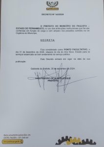 A Prefeitura do Paulista decretou ponto facultativo nas repartições públicas, nesta terça-feira (31/12) e na quarta-feira (1º/01), feriado de Confraternização Universal, com as atividades municipais tendo alterações.